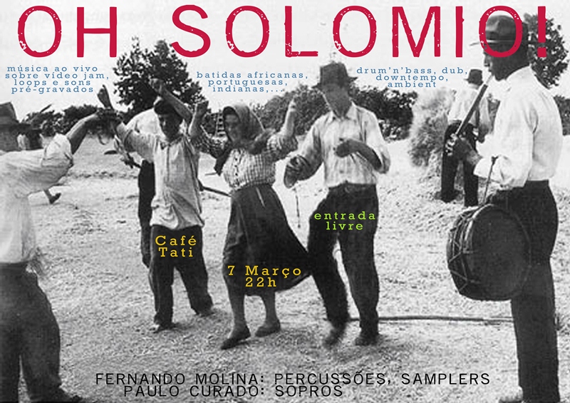 Esta quinta-feira, 7 de março de 2013, o espaço Café Tati recebe os Oh Solomio! pelas 22h, projecto de Fernando Molina com a participação de Paulo Curado. A entrada é livre e é de aproveitar. Continuamente.